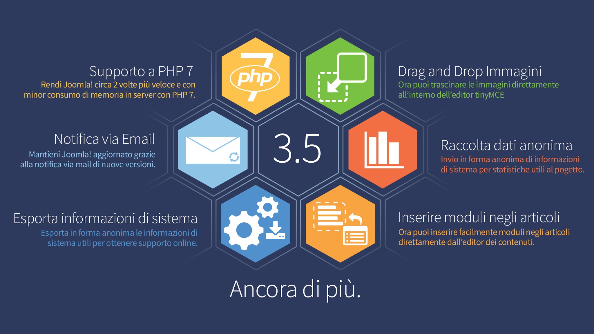 3Compatibilità con PHP 7: Da questa versione 3.5 di Joomla il CMS è pienamente compatibile con la nuova versione di PHP 7. Questa ultima versione di PHP7 garantisce prestazioni superiori alle precedenti versioni. Il sito Joomla risultà così molto più veloce sui server che già utilizzano PHP 7 portando vantaggi nella velocità di generazione delle pagine dal 10 al 30% più veloci rispetto alla precedente versione di PHP 5.6 ed ancora di più rispetto alla precedente versione PHP 5.5.