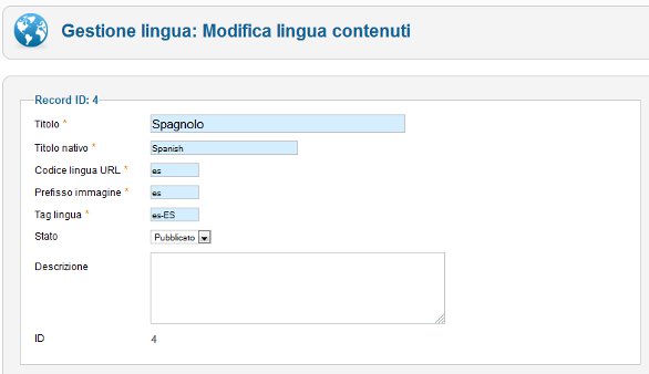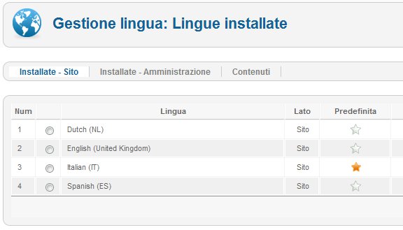 Diamo un’occhiata alla configurazione lingua per vedere se le nuove lingue sono pubblicate (Estensioni -> Gestione lingue -> Installate - sito ed Installate – Amministrazione) e se nella sezione Contenuti gli attributi delle lingue sono corretti (Estensioni -> Gestione lingue ->Contenuti). Se non ci sono contenuti per le lingue installate, createli clikkando su Nuovo e completate i campi (vedi immagine sotto).